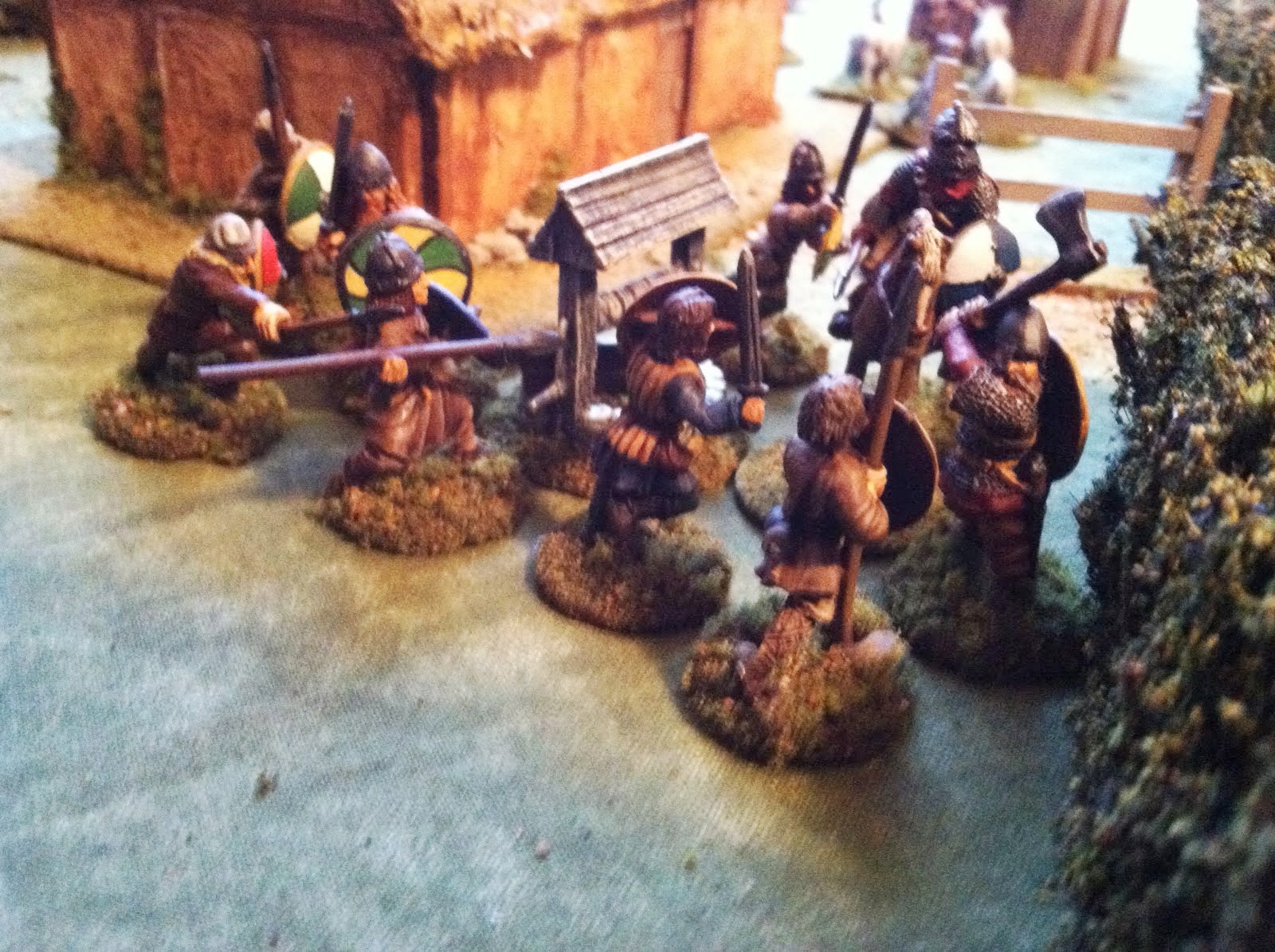 As the Vikings came around a corner in the lane, they could see a group of frightened farmers trying to make a stand. Ragnar slew one with a hasty shot, and the rest of them fled. Meanwhile, Snorri waved one of his followers toward a slinger hiding behind the hedge to the right, but the man hesitated.